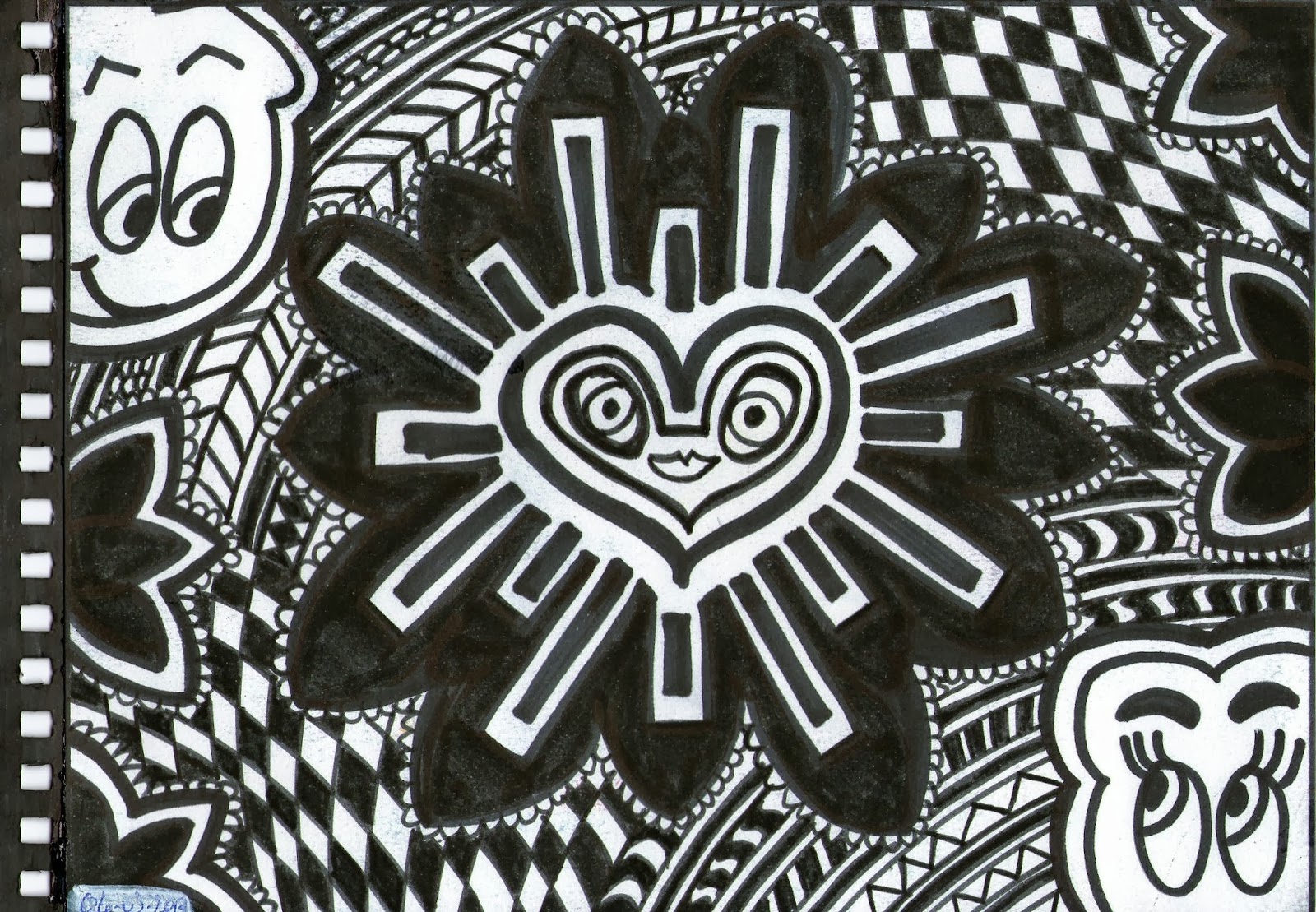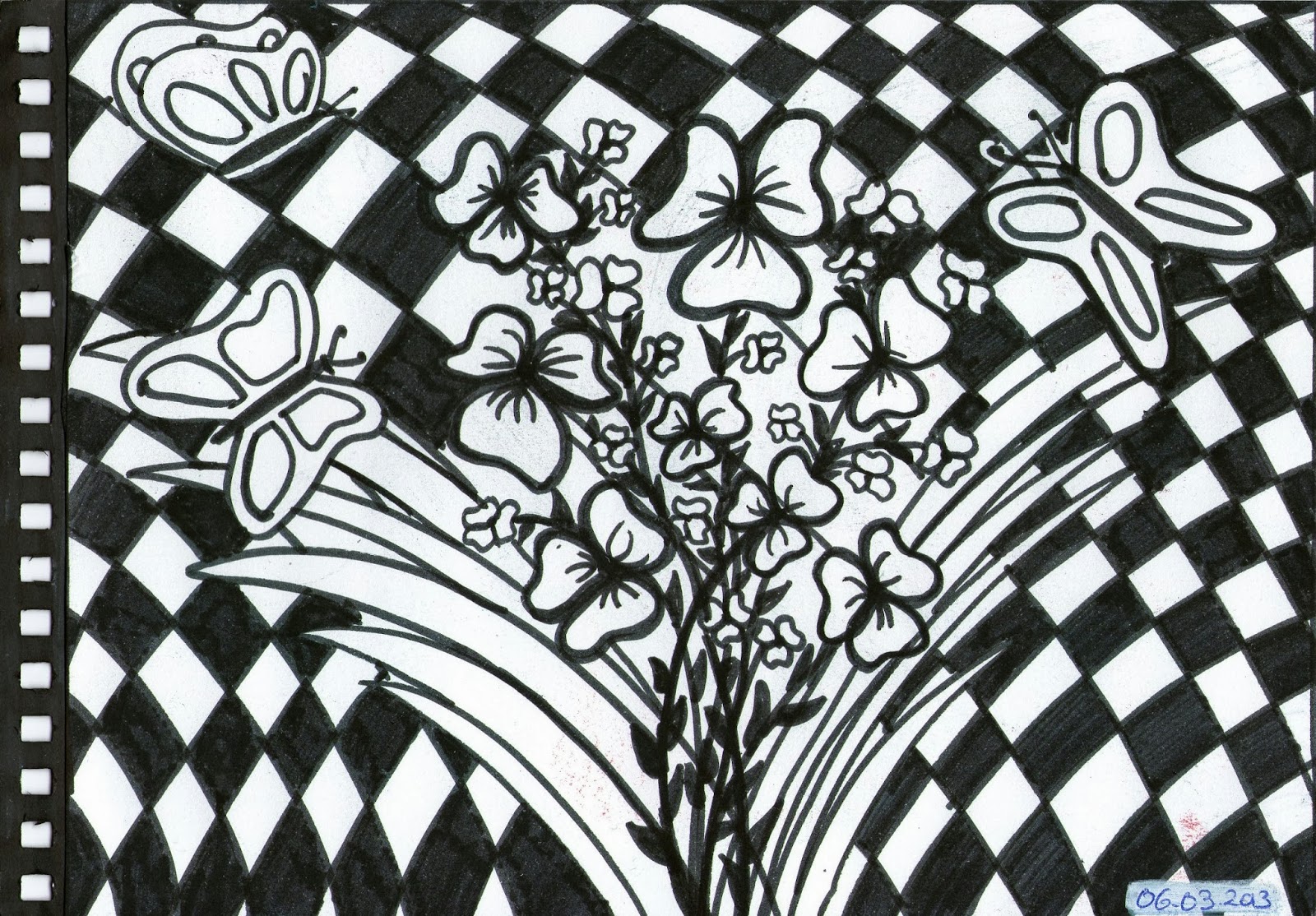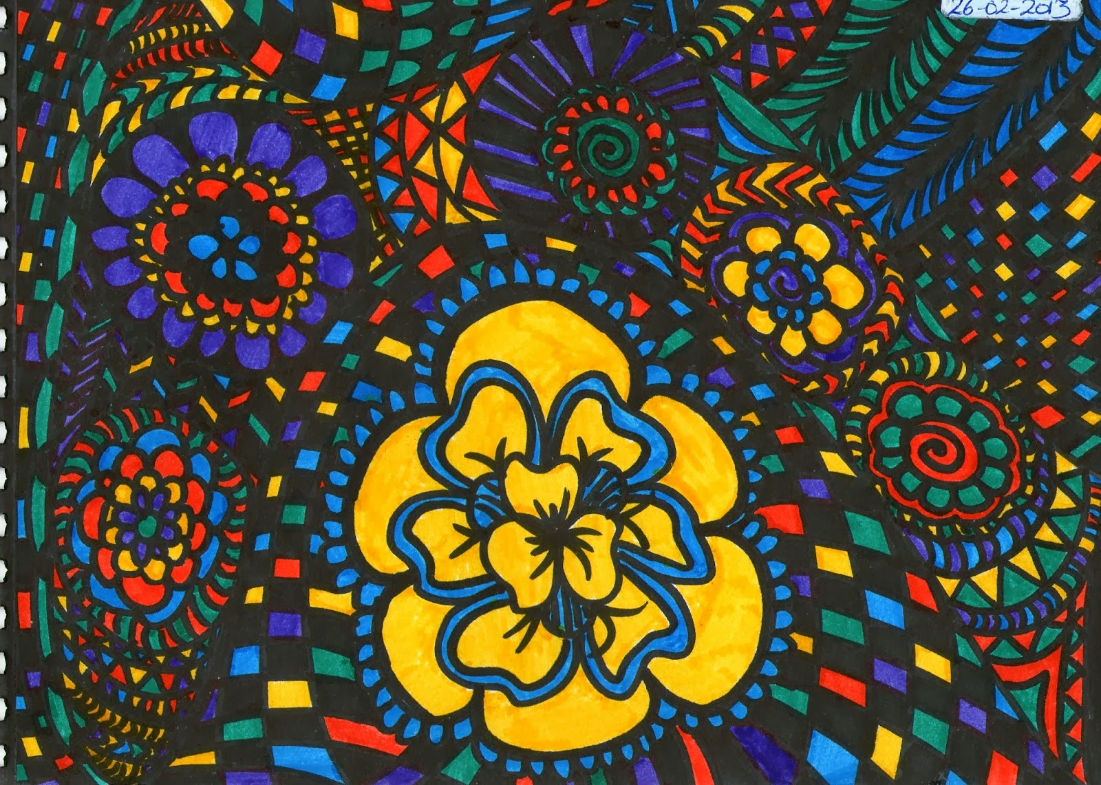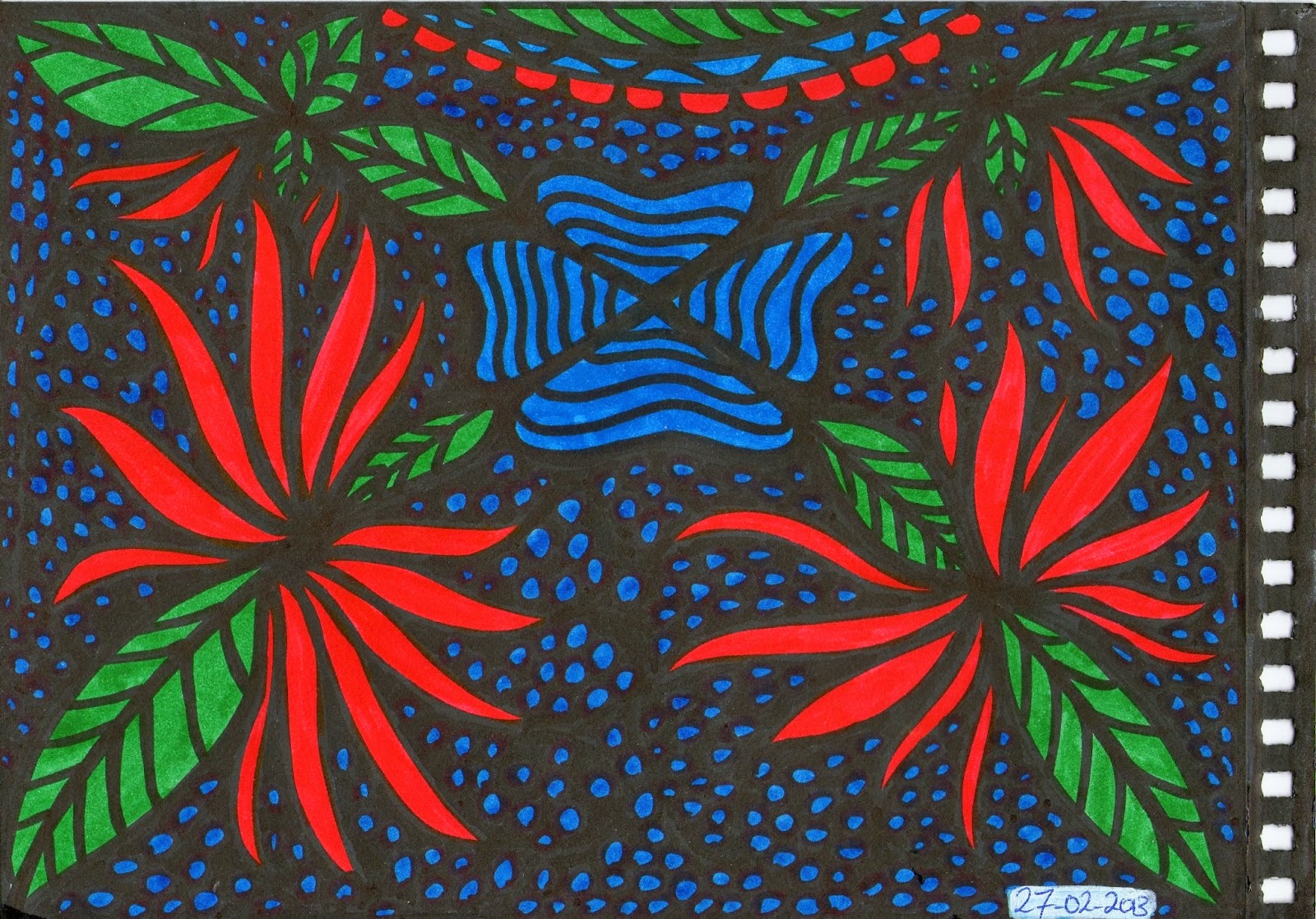It is OK to use pencil to outline your drawing/painting. I used to be scared of using this before in case it showed later on in the final work, but this page is proof that this doesn’t happen. When using felt tip coloring pens, be careful not to get any water near them because they bleed over the rest