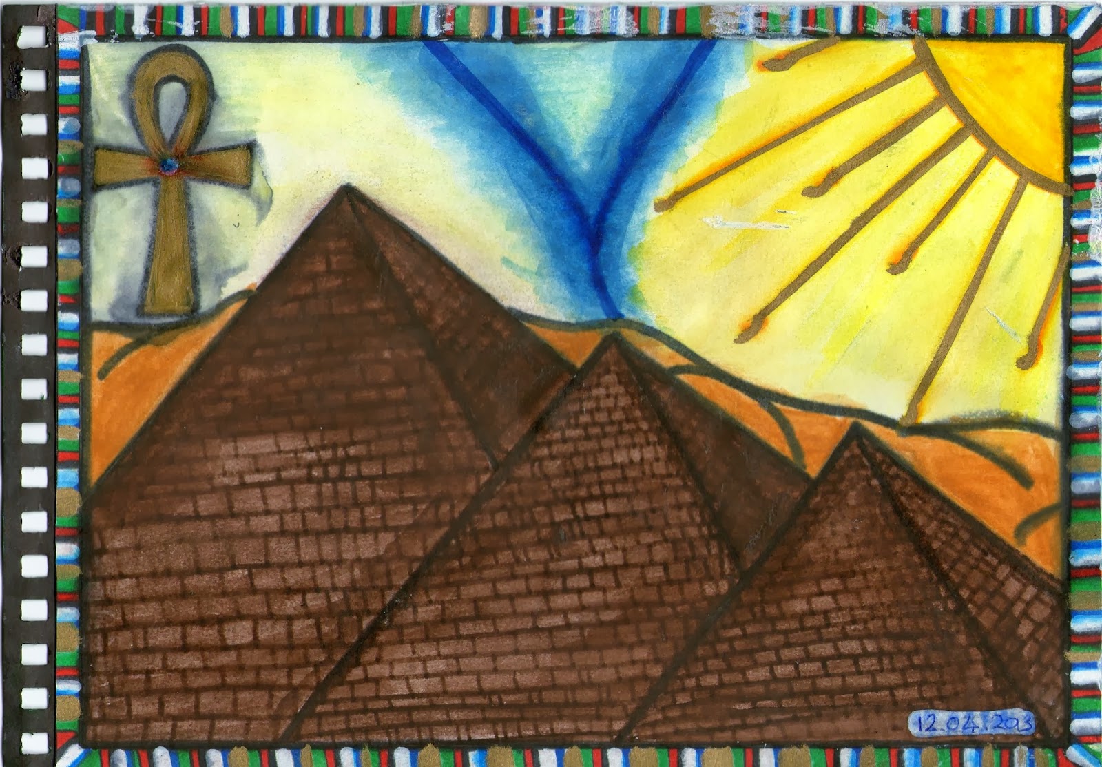 A drawing of the pyramids of Giza. We used to get this assignment a lot at school when I was a kid, draw something about Egypt. I always drew the pyramids of Giza. So, when soft pastel were on offer at a local store, I decided to get me a box. I had no idea what to draw and then I saw the pyramids in my head. Even though I have acrylic paint, I still didn’t have the courage to use it with a bruth. The nice thing here with the soft pastels was that I had to apply water using a brush. This page depicts the pyramids, the sun as was depicted by ancient Egyptians, the nile and the key of the nile (some call it the key of life).